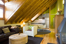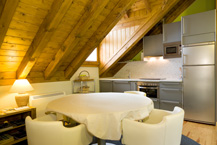 Distribución: Dispone de dos dormitorios dobles abuhardillados, un baño y una estancia en la que se encuentran la cocina y el salón-comedor. La cocina está equipada con microondas y lavavajillas y el salón con chimenea, TV y DVD.