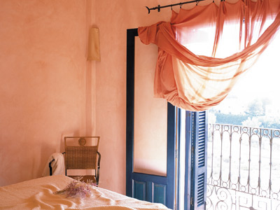 Casa blanca de estilo mediterráneo, con puertas y ventanas teñidas de azul.