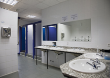 Distribución: Se compone de 26 habitaciones múltiples con distinto número de plazas distribuidas en literas y 2 de ellas con baño de uso exclusivo. Los servicios higiénicos incluyen 17 duchas, 28 inodoros, 6 urinarios y 36 lavabos.