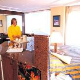 Dispone de 130 habitaciones totalmente equipadas con cuarto de baño con secador de pelo, T.V. vía satélite con más de 15 canales, teléfono, mini-bar, aire acondicionado, calefacción, ventilador de techo, caja de seguridad (de pago) y balcón o terraza (la mayor parte con vista al mar lateral).